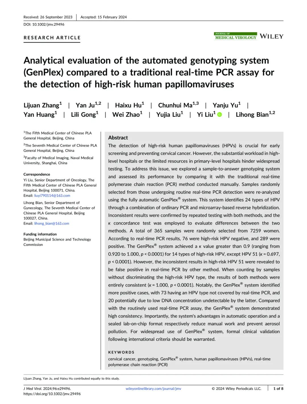 克日,中国人民解放军总医院第五医学中心刘毅教授团队在《Journal of Medical Virology》(影响因子=12.7)宣布了一项关于高危HPV检测的主要研究效果,问题为“Analytical evaluation of the automated genotyping system (GenPlex) compared to a traditional real‐time PCR assay for the detection of high‐risk human papillomaviruse”。(全自动基因分型检测系统(GenPlex)与古板实时荧光PCR要领用于检测高危型人乳头瘤病毒的剖析评估)。