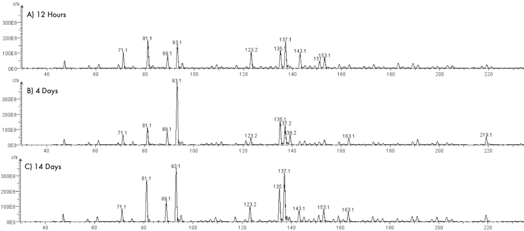¡¤ÒÒ´¼¶þ¾ÛÌ壨m/z 93£©Å¨¶ÈÔÚ4ÌìʱµÖ´ï·åÖµ£¬Åú×¢·¢½ÍÒªº¦ÆÚÔÚǰ¼¸Ì죻