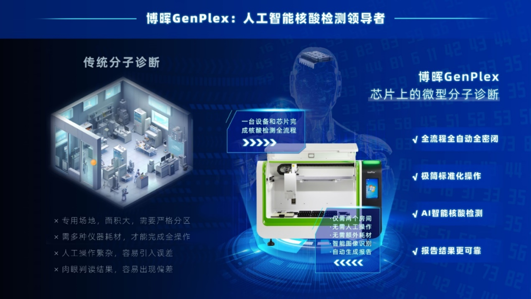 太阳集团官网GenPlex系统将DNA提取、纯化、PCR扩增、杂交检测和效果判读所有核酸检测办法高度集成在7*8cm巨细的微流控芯片,接纳AI人工智能算法,举行全程监控,Robot机械臂精准完成每一步操作, 检测效果可视图像化,AI自动判读。海内首次真正实现核酸检测的集成化、标准化、人工智能化。